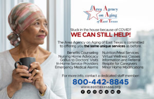 East Texas, August 5, 2020 – ETCOG’s Area Agency on Aging (AAA) program has received a total of $2,695,330 in COVID-19 Families First Coronavirus Response Act Funds. The Families First Coronavirus Response Act, signed into law by President Trump on March 18, 2020, provided the additional funding for the nutrition services programs authorized by the Older Americans Act of 1965. The need for these services, particularly home-delivered and packaged meals, has increased as community measures to slow transmission of COVID-19 have closed meal sites and have left many family caregivers unable to assist their older loved ones. A total of $628,039 has been received for the East Texas AAA senior nutrition program and will be expended through our home-delivered and congregate meal programs. The congregate meal program has transitioned to “grab and go” at all meal sites for safety purposes. A total of $2,067,291 was received for other AAA service delivery programs. For more information, please see ETCOG’s full news release at https://www.etcog.org/area-agency-on-aging-receives-funding-to-expand-services-for-east-texas-seniors-through-covid-19-pandemic